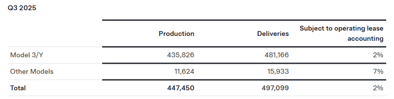 当地时间周四(10月2日),美国特斯拉公司在官网公布了其2025年第三季度的汽车生产量和交付量报告,这一动态引发了全球汽车市场与特斯拉股票投资者的广泛关注。具体数据显示,特斯拉在这一季度共交付了497,099辆汽车,同比增长7.4%,刷新了季度交付纪录,几乎强于市场上所有预期。FactSet汇总数据显示,华尔街原本预计447,600辆。