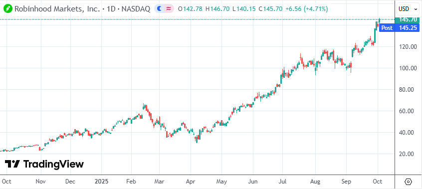 日内,Robinhood股价收涨4.71%,再度刷新纪录。年初至今,该股已经累计上涨291%。与此同时,比特币价格突破12万美元/枚,也创下新高,加密货币市场热度持续攀升。