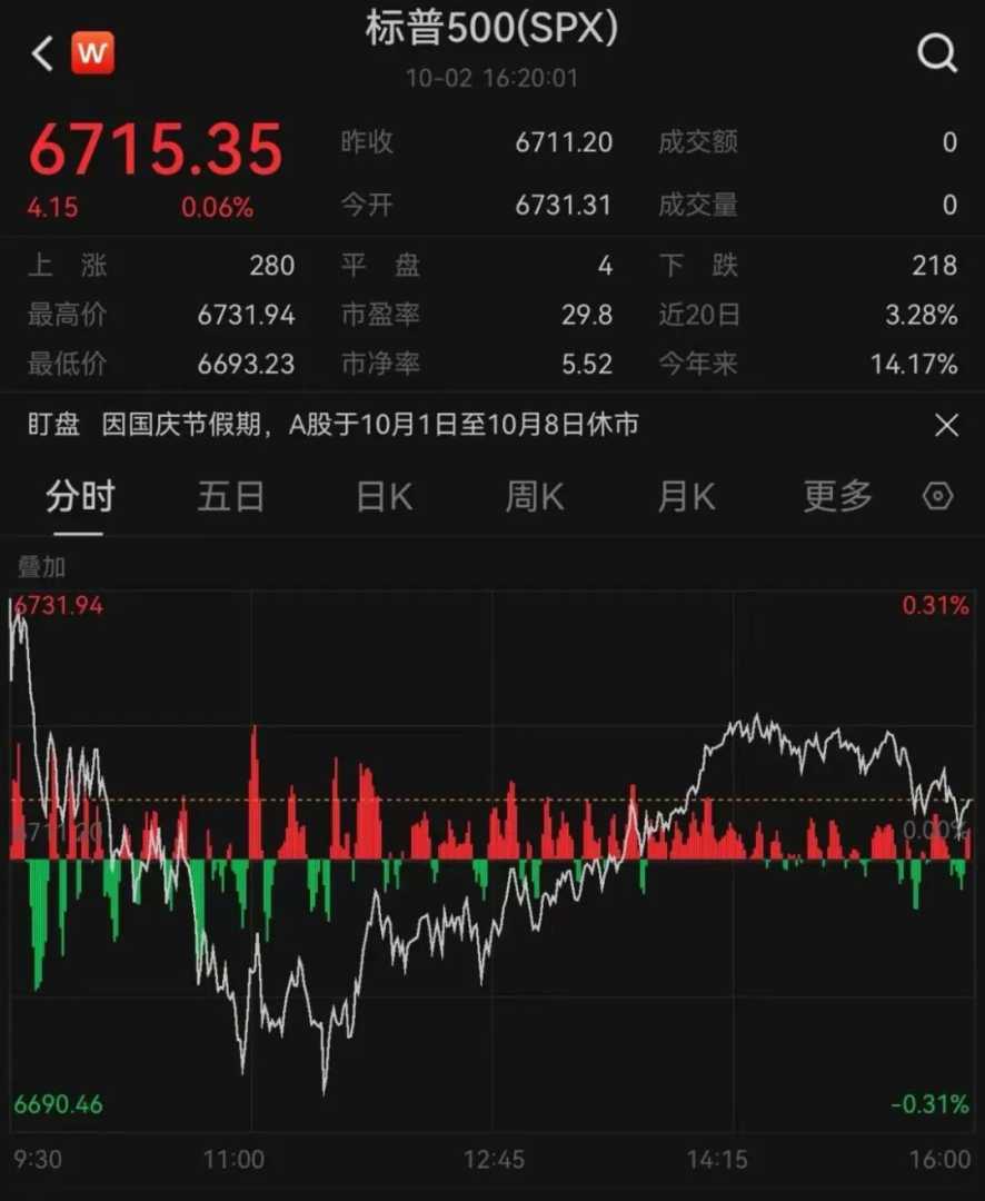 美东时间10月2日(周四),美股早盘承压,标普500指数和道琼斯指数开盘高开低走。截至收盘,道琼斯指数上涨0.17%,报收于46519.72点;标普500指数上涨0.06%,报收于6715.35点;纳斯达克指数上涨0.39%,报收于22844.05点。美国政府关门进入第二日,经济数据日程受干扰,原定于周四盘前发布的单周失业救济申请人数和8月耐用品订单均未如期发布。达拉斯联储主席洛根重申通胀风险,称降息需“格外谨慎”,避免过度宽松迫使联储收紧货币,导致美股主要指数转跌。午盘时,媒体称参议院银行委员会的助理透露,劳工统计局可能准备如期周五发布9月劳动力数据,美股三大指数盘中上涨。