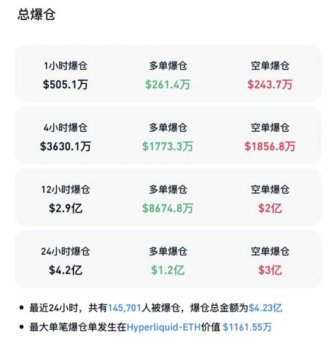 Coinglass数据显示,过去24小时加密货币市场共有近15万人被爆仓,爆仓总金额为4.23亿美元,其中多单爆仓1.2亿美元,空单爆仓3亿美元。其中,最大单笔爆仓发生在Hyperliquid-ETH,市场风险凸显。
