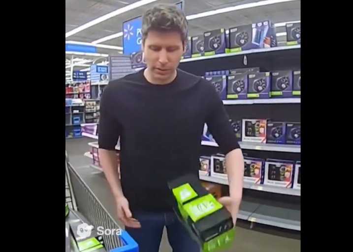 特别是Sora还有一个“客串”(cameos)功能。用户只需在App中简短录制一次音视频,即可以将自己直接带入其的Sora场景中,比如可以生成与朋友扳手腕的AI视频。为了推广这个功能,OpenAI首席执行官萨姆·奥尔特曼亲自下场,成了这场全民AI创作中出场率最高的“演员”:他出现在会议室与用户交谈,甚至成为偷窃英伟达芯片的小偷。