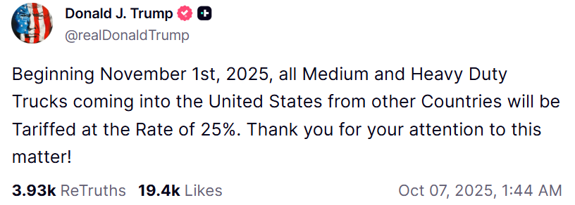 据央视新闻,当地时间10月6日,美国总统特朗普在其社交平台“真实社交”上发文表示,自2025年11月1日起,所有从其他国家和地区进口至美国的中型和重型卡车将被征收25%的关税。