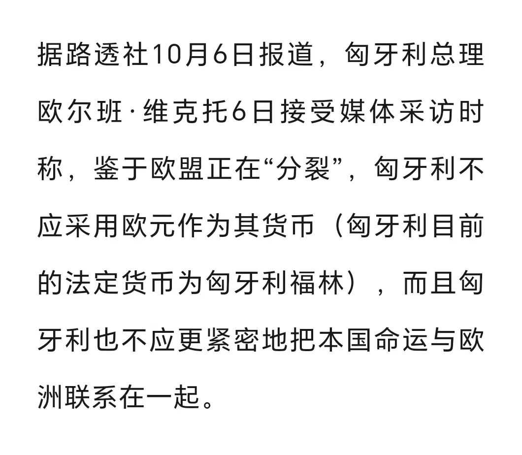 匈牙利总理欧尔班在当地时间6日播出的一档节目中明确表示,匈牙利政府没有加入欧元区的计划,并强调目前匈牙利不应将自己的命运更紧密地与欧盟联系在一起。这一表态凸显了匈牙利在货币政策和经济自主权方面的独立立场,对区域经济格局产生潜在影响。