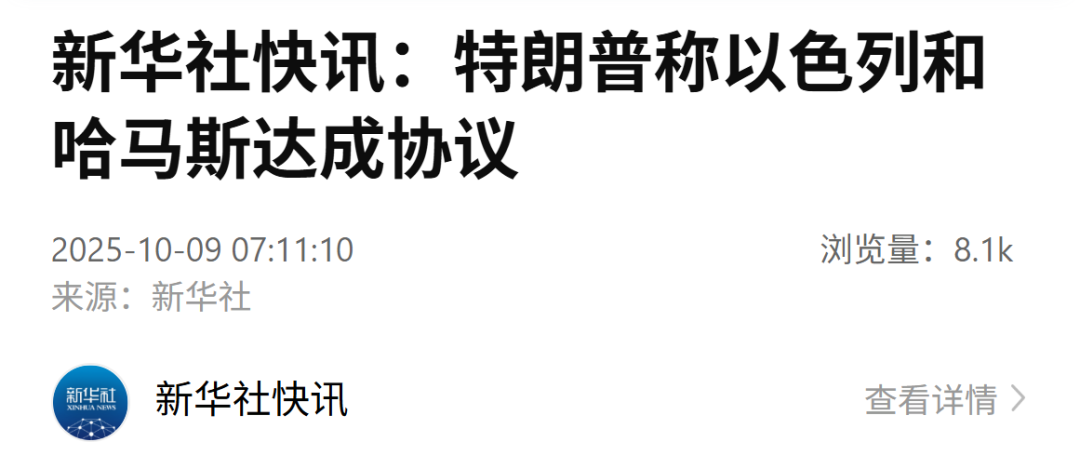 据新华社报道,美国总统特朗普宣布以哈同意美方“和平计划”第一阶段。央视新闻称哈马斯同意加沙停火协议,双方9日将在埃及签署协议,包括开放过境点、释放被扣押人员等,由多国担保。