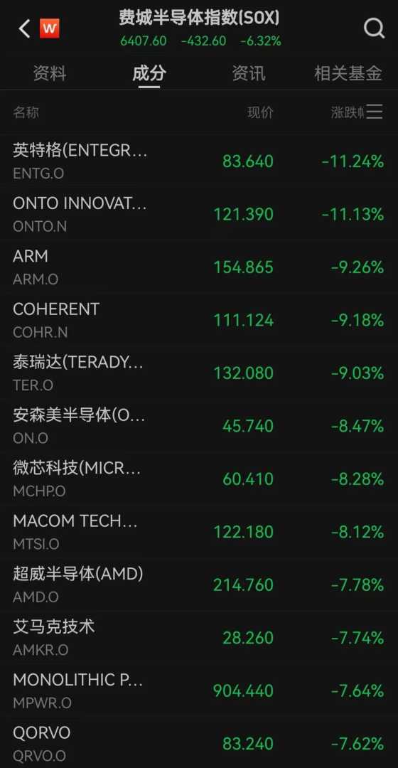 大型科技股全线下跌,万得美国科技七巨头指数下跌3.65%。个股方面,特斯拉跌超5%,亚马逊、英伟达跌超4%,META、苹果跌超3%,微软跌超2%,谷歌-C跌超1%。芯片股表现疲软,费城半导体指数跌6.32%,ARM跌超9%,安森美半导体、微芯科技跌超8%,超威半导体、高通跌超7%,台积电跌逾6%,博通跌超5%。