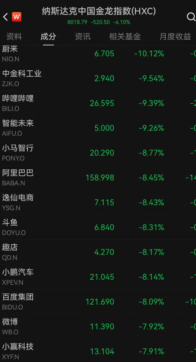 值得一提的是,美国科技巨头又在盘后迎来新一轮跳水。英伟达、特斯拉、甲骨文的跌幅均超2%。新思科技、Cadence跌幅超3%。纳斯达克中国金龙指数跌6.10%,老虎证券、世纪互联、禾赛科技跌超11%,蔚来跌超10%,哔哩哔哩跌逾9%,阿里巴巴、小鹏汽车、百度集团跌超8%;雾芯科技涨超1%。