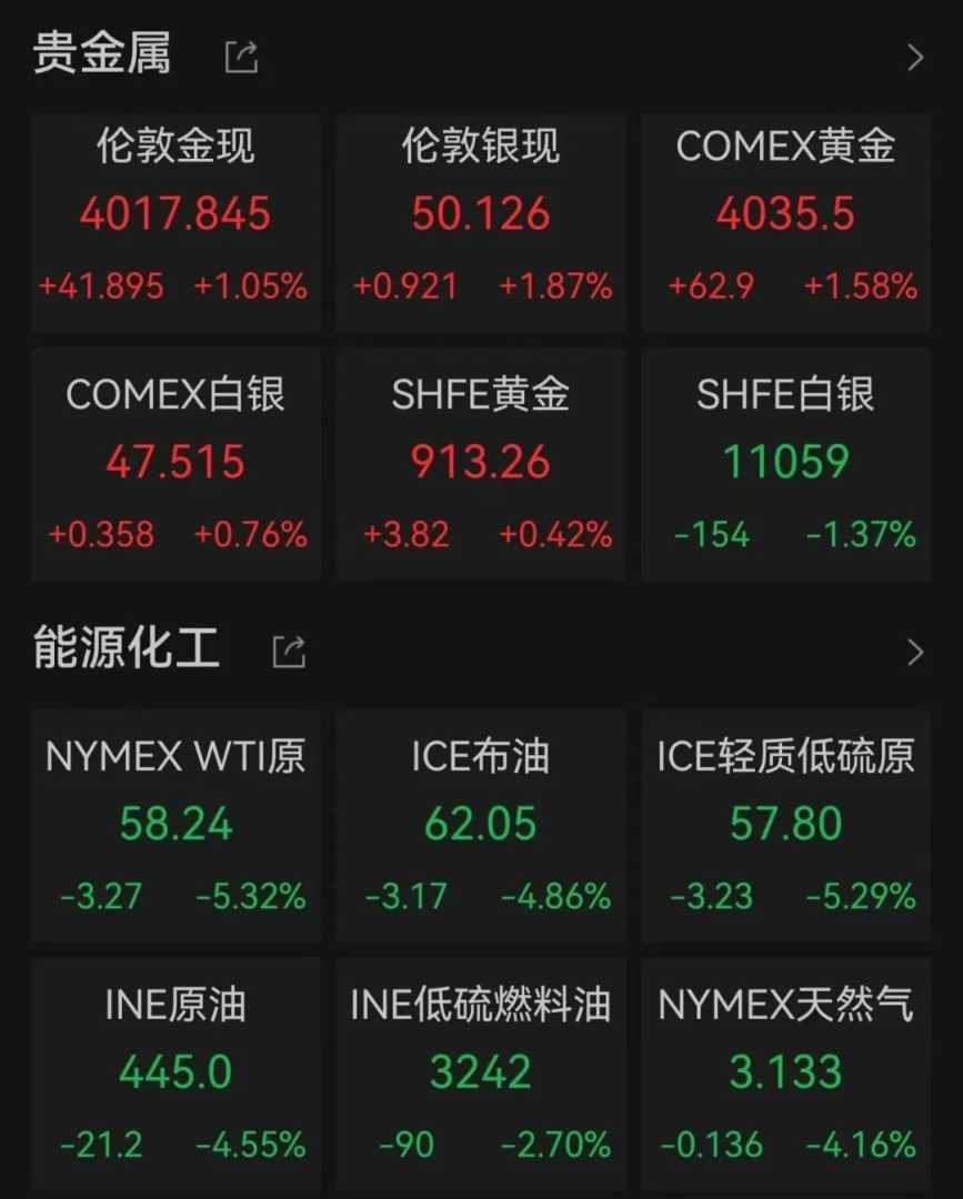 大宗商品方面,国际黄金价格拉升,原油、铜价格跳水。贵金属方面,截至收盘,伦敦现货黄金价格涨超1%,报4017.845美元/盎司;COMEX黄金期货涨超1%,报4035.5美元/盎司;伦敦现货白银价格涨近2%。国际原油期货价格全线下跌,美国WTI原油期货、布伦特原油期货分别下跌5.32%、4.86%。有色金属方面,伦敦基本金属全线下跌,其中LME期铜、LME期锡均跌超4%,LME期铝、LME期镍跌超1%。