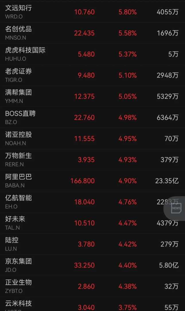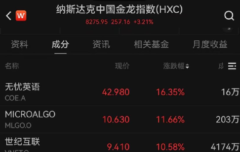 热门中概股普涨,纳斯达克中国金龙指数收涨3.21%(SEO关键词3:中概股普涨)。无忧英语、MICROALGO和世纪互联均涨超10%;中概互联网板块中,阿里巴巴、京东分别上涨4.90%、4.40%。