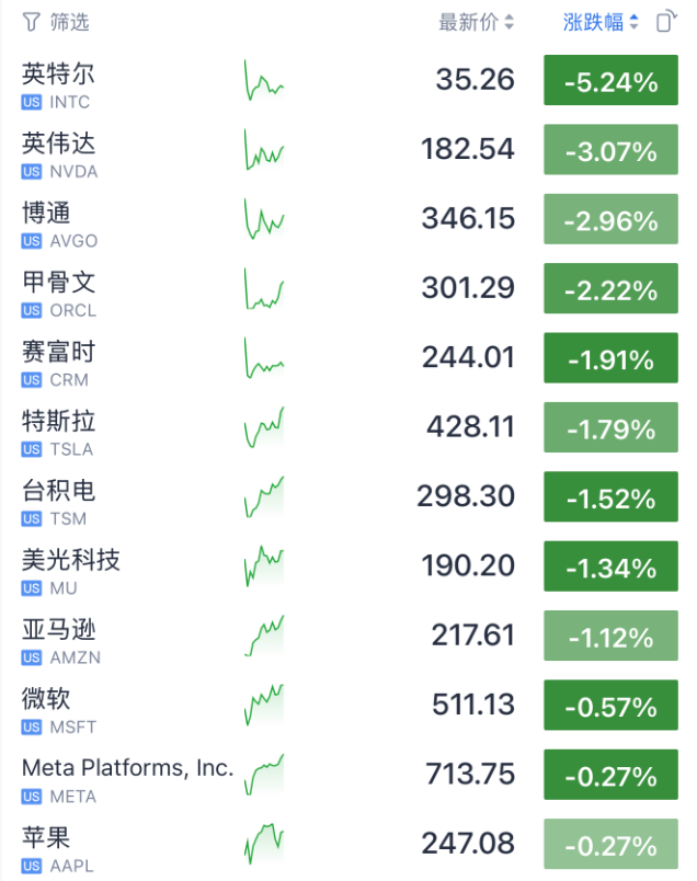 10月14日,受贸易争端影响,美股三大指数开盘集体大跌,但随后止跌回升,跌幅明显收窄。道指盘初一度暴跌约600点,随后转涨,纳指跌幅收窄至0.5%以内,标普指数同步回升。美股市场(关键词1)今晚领跌的是AI科技股,英伟达下跌超3%、特斯拉和甲骨文分别下跌1.79%与2.22%。