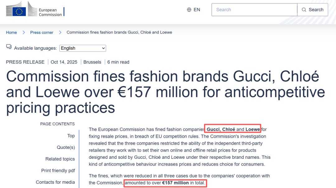 据新华社,欧盟委员会通报,古驰、蔻依、罗意威因限制零售商定价,违反反垄断法规,被处以合计约1.57亿欧元罚款。三家企业均承认违法并配合调查,罚款额获减免。