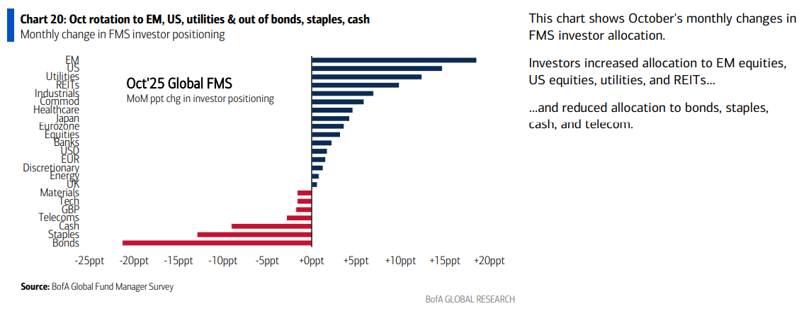 美国银行最新发布的10月全球基金经理调查显示,全球基金经理对股市的乐观情绪达到了2月以来最高水平,但随着人工智能(AI)概念股今年经历了持续的强劲上涨,对AI泡沫的担忧也正上升至空前水平。本次调查于10月3日至9日进行,共收集166位管理着4000亿美元资产的参与者意见,调查显示,基金经理本月的股票配置比例攀升至八个月高点,债券配置则降至2022年末以来最低水平。大宗商品和新兴市场股票的配置已飙升至多年来的最高水平。