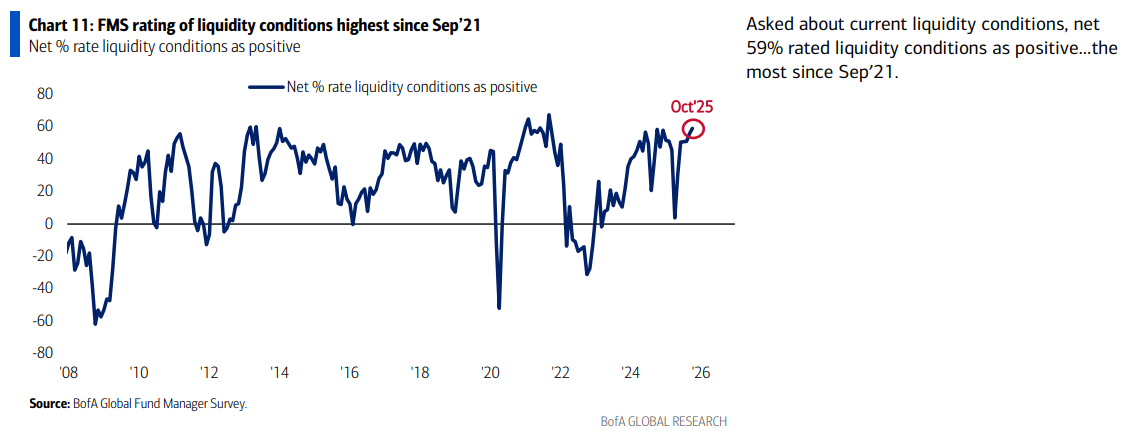 美国银行10月全球基金经理调查显示,基金经理对股市乐观情绪达2月以来最高,但对AI泡沫担忧空前。基金经理股票配置比例攀升,债券配置降至低位,黄金成最拥挤交易。
