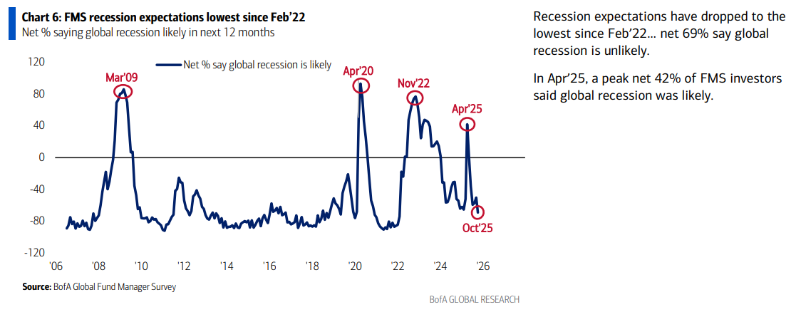 受访者的现金配置比例骤降至了3.8%,处于调查历史上的“极低”水平。这表明机构投资者的风险偏好激进,流动性状况被视为2021年9月以来最佳。基金经理们基本抛却了对经济衰退的担忧。调查显示,受访者对经济增长乐观情绪出现自2020年10月以来最大的六个月升幅。