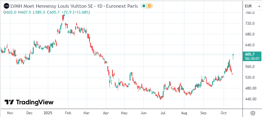经历了一段时间回调后,这家全球最大奢侈品集团,终于迎来积极信号。LVMH周二(10月14日)发布的业绩报告标题就为《2025年第三季度趋势改善》。受该消息影响,LVMH欧股周三早盘涨近1%,股价创今年3月以来的最高水平,市场情绪高涨。