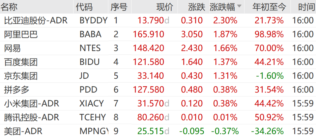 中概股整体跑赢大盘,纳斯达克中国金龙指数涨1.70%,万得中概科技龙头指数涨0.71%。比亚迪股份涨2.30%,阿里巴巴涨1.87%,网易涨1.66%,领涨中概科技龙头指数成份股。