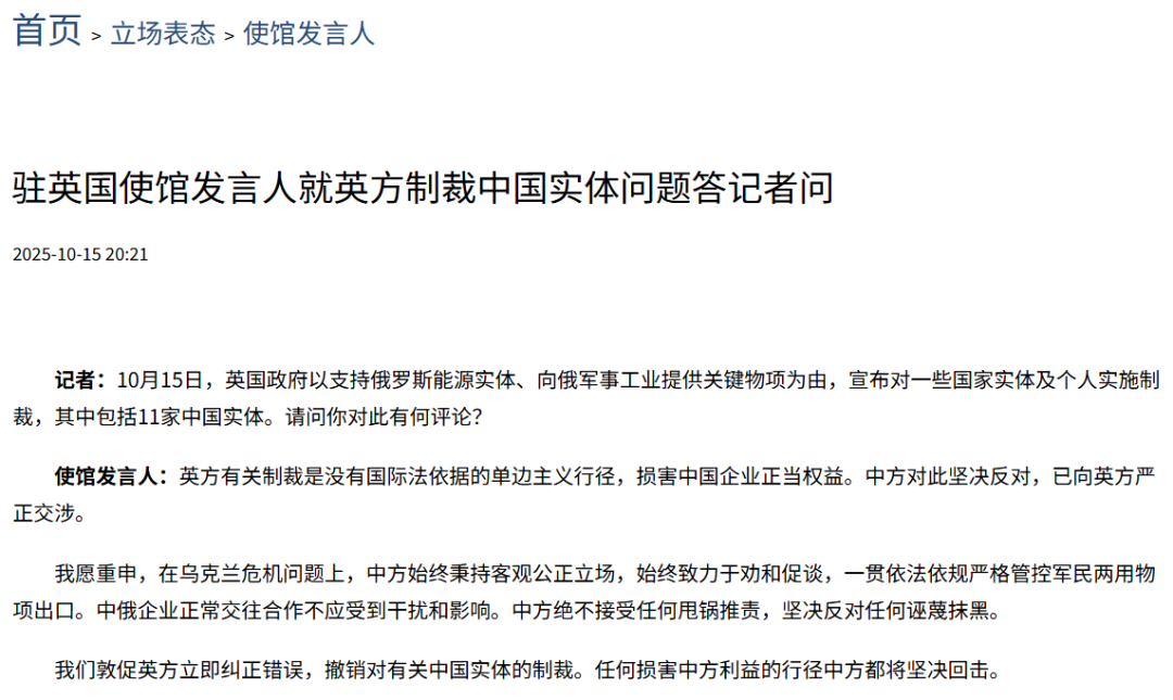 使馆发言人:英方有关制裁是没有国际法依据的单边主义行径,严重损害中国企业正当权益。中方对此坚决反对,已第一时间向英方严正交涉,表明中方立场。