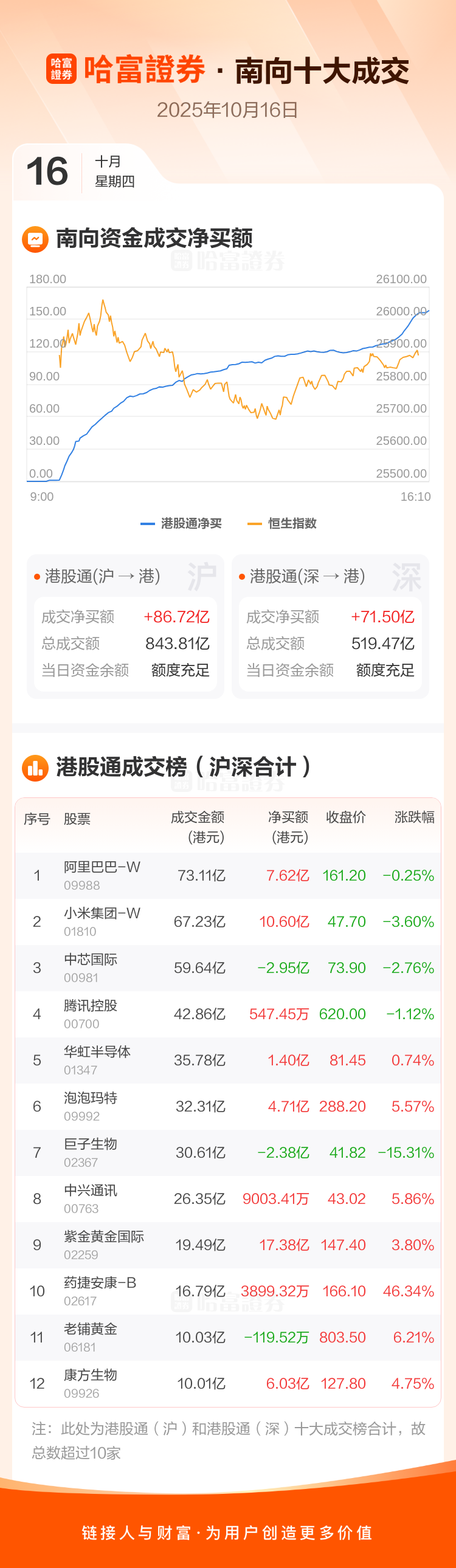 10月16日恒生指数跌0.09%,收报25888.51点。南向资金净买入港股158.22亿港元,成交额1363.27亿港元。紫金黄金国际等获净买入,中芯国际等遭净卖出。