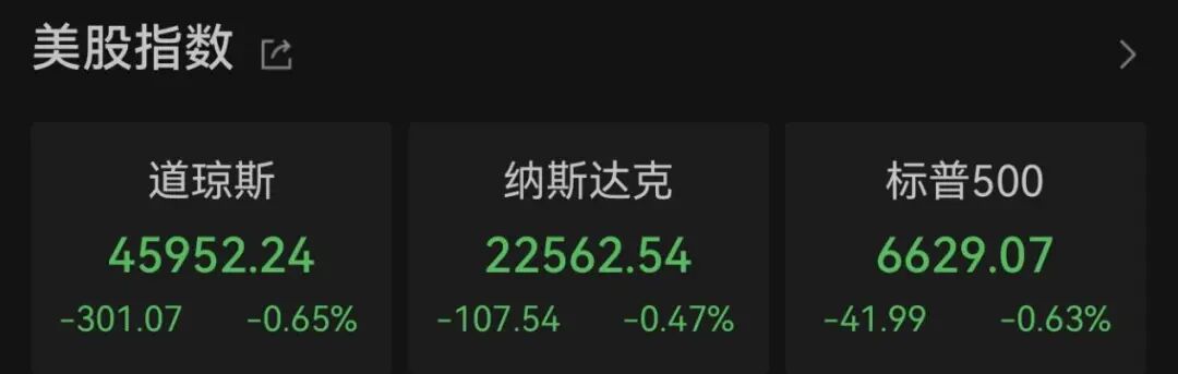 美国三大股指全线收跌。截至收盘,道指跌0.65%,报45952.24点;标普500指数跌0.63%,报6629.07点;纳指跌0.47%,报22562.54点。