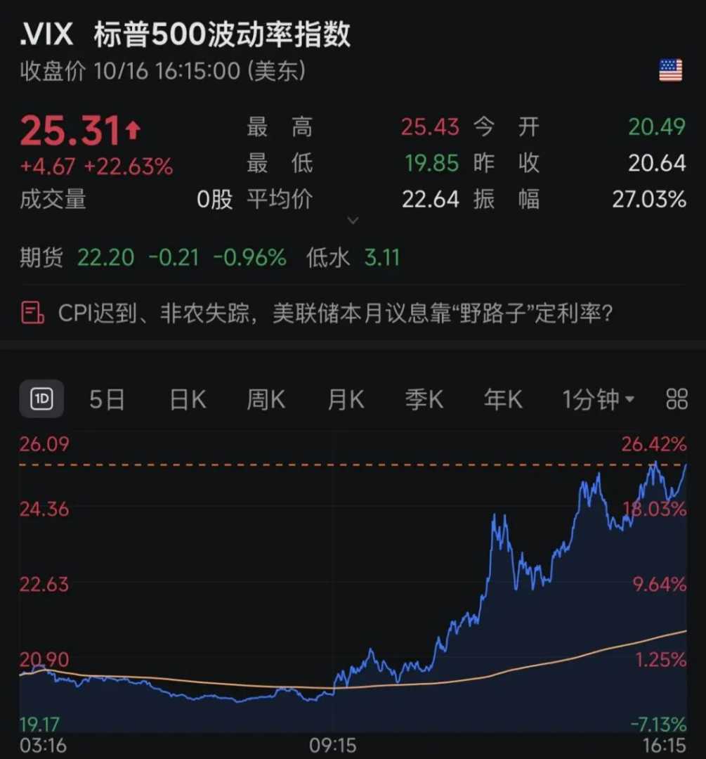 【导读】美股全线收跌,恐慌指数VIX飙升至五月以来最高水平,市场对银行业坏账担忧加剧(美股动态)。美东时间10月16日(周四),美国三大股指全线收跌,美国政府停摆进入第三周,美国国会参议院第十次否决临时拨款法案;市场对银行业坏账的担忧情绪加剧,银行股普跌;恐慌指数VIX飙升至五月以来最高水平;原油跌至五个月新低,金价再创纪录(市场分析)。