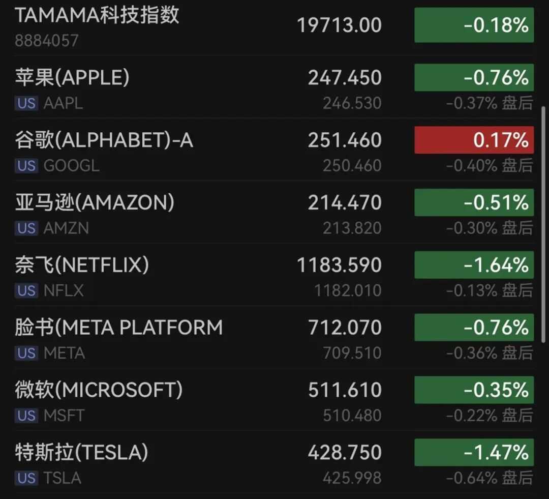 大型科技股多数下跌,特斯拉跌超1%,脸书跌0.76%,苹果跌0.76%,亚马逊跌0.51%,微软跌0.35%,英伟达涨超1%,谷歌涨0.17%(科技股动态)。