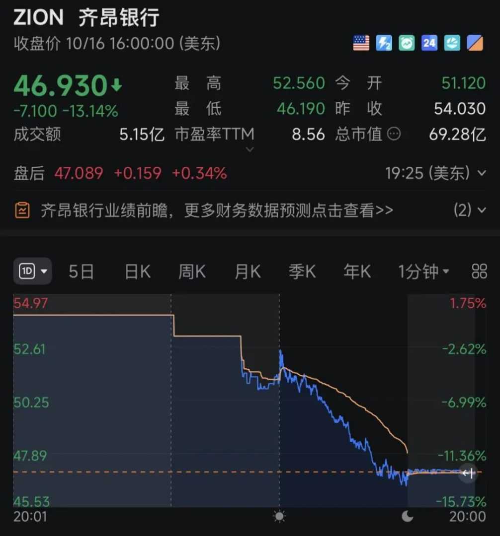 市场对银行业坏账的担忧使银行股大跌。ZION银行由于对几家借款方的坏账计提了大额拨备,股价暴跌13.1%。美国西部联盟银行(Western Alliance Bancorporation,WAL)在指控某借款方存在欺诈行为后,收盘时股价下跌10.8%。标普地区银行精选行业指数周四暴跌6.3%,创出4月关税引发抛售以来的最大跌幅。