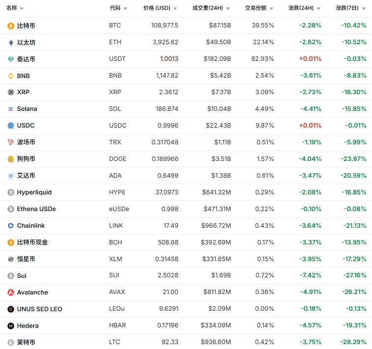 刚刚过去的24小时内,加密货币集体跳水,比特币一度从11.15万美元跌至10.75万美元,盘中跌幅一度超过3.5%。以太坊盘中也一度跳水超5%,BNB、Solana等纷纷跟跌。截至记者发稿时,比特币、以太坊、XRP跌超2%,BNB、艾达币跌3%,Solana跌超4%。
