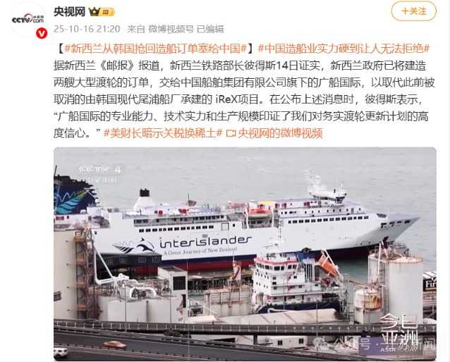 新西兰铁路部长证实,政府将建造两艘大型渡轮订单交给广船国际,取代此前韩国项目。广船国际专业能力获高度认可,彰显中国船舶制造实力。