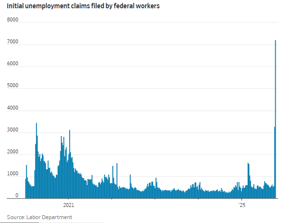 失业救济申请人数的激增可能反映了两方面因素。政府停摆促使许多暂时休假的联邦政府工作人员开始申请失业救济;而一些接受特朗普政府延期辞职计划并在最近失去工作的雇员,可能也正在申请失业金。在大多数官方经济报告因政府停摆而推迟发布的背景下,这些失业救济申请数据让人们得以一窥美国联邦就业领域的动荡。尽管美国劳工部无法公布其通常每周四公布的每周失业救济申请数据,但人们可以获取用于编制该数据的州一级数据。目前,仅亚利桑那州、马萨诸塞州、内华达州和田纳西州四个州的数据尚未更新。