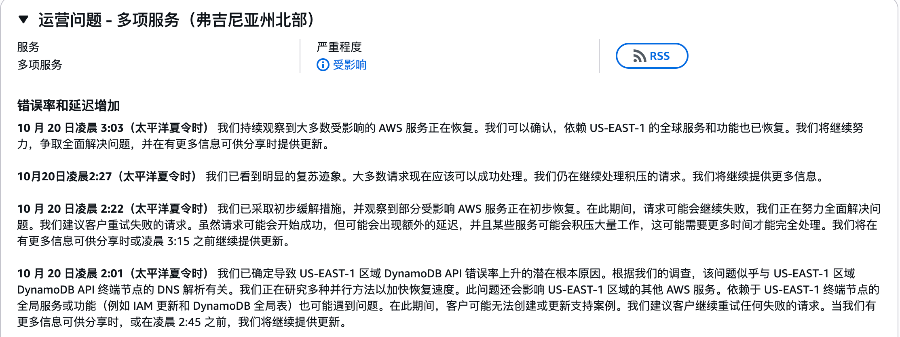 其最新回复表示,“我们持续观察到大多数受影响的AWS服务正在恢复。”