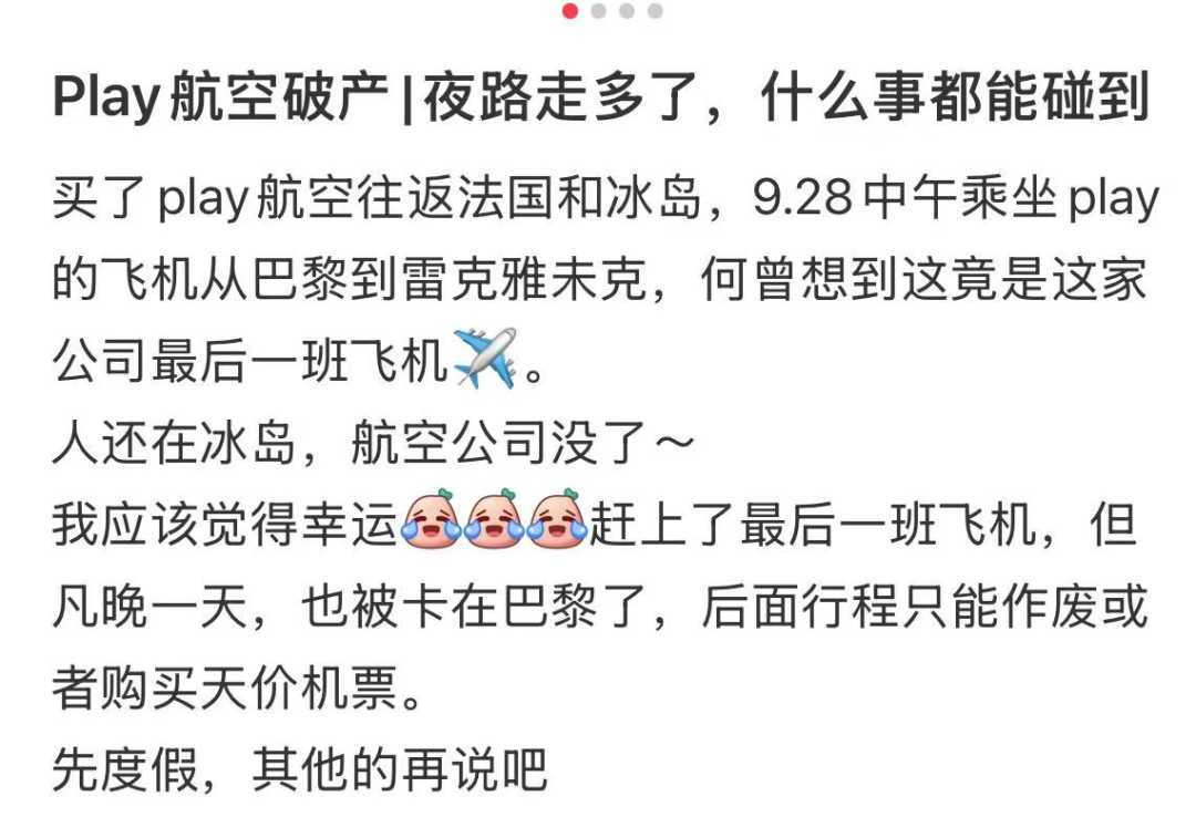 有网友发贴称,买了play航空往返法国和冰岛的机票,9月28日中午乘坐飞机从巴黎到雷克雅未克,何曾想到这竟是这家公司最后一班飞机,人还在冰岛,航空公司就没了。“幸运赶上最后一班飞机,但凡晚一天也被卡在巴黎,后面行程只能作废或者买天价票了”。