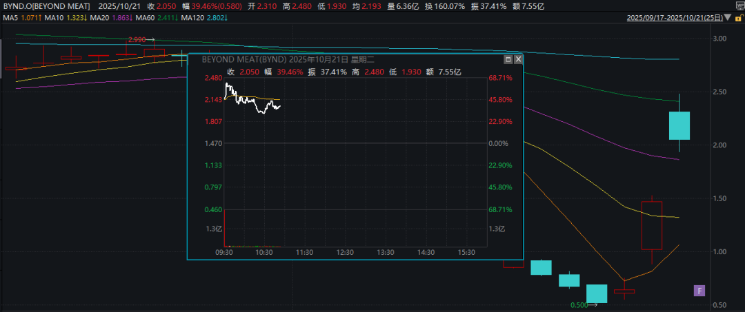 “人造肉第一股”暴涨,上周,股价跌破1美元的“人造肉第一股”Beyond meat(BYND)一度拉响退市警报。但自上周五(10月17日)开始,该公司连续股价连续大幅上涨。上周五,Beyond meat股价盘中一度涨超40%,收涨约24%。本周一,Beyond meat估计则是大涨约127%,盘中一度涨超136%。周二开盘后,Beyond meat一度上涨超过68%,近三个交易日股价累计最高涨幅超过300%。