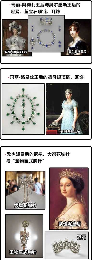 法国文化部公布的8件被盗珠宝的清单如下:玛丽-阿梅莉王后与奥尔唐斯王后的头饰套件中的冠冕、玛丽-阿梅莉王后与奥尔唐斯王后的蓝宝石套装中的项链、玛丽-阿梅莉王后与奥尔唐斯王后的蓝宝石套装中的耳环、玛丽-路易丝王后的祖母绿套装中的项链、玛丽-路易丝王后的祖母绿套装中的耳环、“圣物匣式胸针”、欧也妮皇后的冠冕、欧也妮皇后的大襟花胸针。