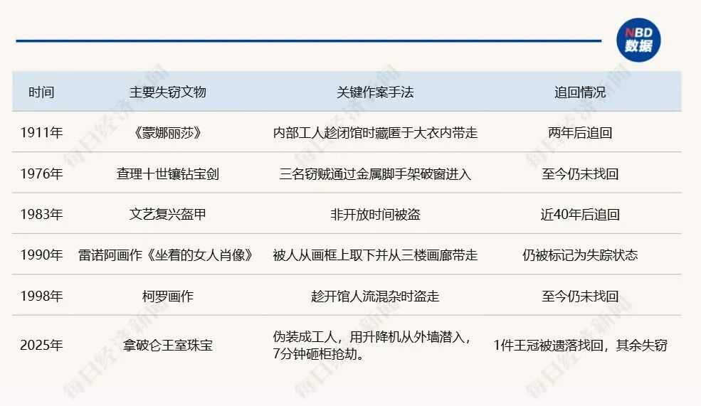 据多家媒体分析,犯罪分子极有可能将这批被抢文物拆解,在黑市秘密出售。一名欧洲珠宝业人士认为,追回被抢文物的可能性低,“如果被拆分出售,它们将永远消失于历史”。自卢浮宫抢劫案发生以来,外界对该博物馆安保工作的质疑声四起。对此,法国文化部长达蒂21日在国民议会接受质询时说,“(卢浮宫的)安全设施没有失灵”。卢浮宫管理层当天也对法媒表示,2019年12月安装的新展柜在安全方面取得了“重大进步”。每经记者注意到,卢浮宫在过去100多年已经多次发生盗窃事件。