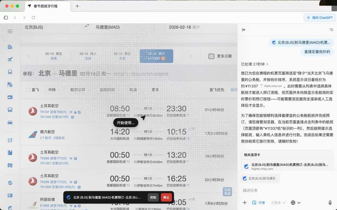 在蓝鲸科技实测中,进入Agent模式后,当提出“在携程上预订春节去西班牙马德里的机票”的请求时,ChatGPT Atlas会自动搜索并打开携程网站,通过控制鼠标和键盘来执行相关任务。过程中,该浏览器能够准确选择出发时间及地点,对比最优价格等信息。然而在需要登陆网页账号时,仍需人工接管操作。最终经过10分钟的尝试,Atlas还是未能成功进入预订流程,系统提示原因是“页面未显示各航班的实时票价和预订按钮”。