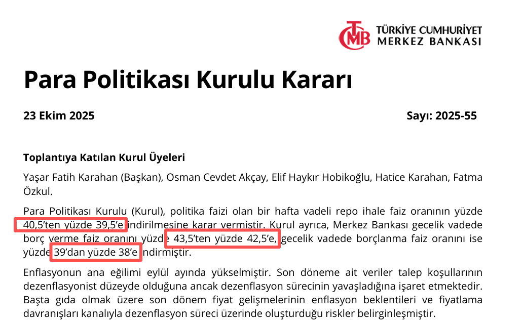 大家好!一起来关注近期海外央行的降息情况及全球降息趋势。10月23日,土耳其央行货币政策委员会(MPC)宣布,将政策利率(即一周回购利率)从40.5%下调至39.5%,符合市场预期。委员会还将央行隔夜贷款利率从43.5%下调至42.5%,将隔夜借款利率从39%下调至38%。