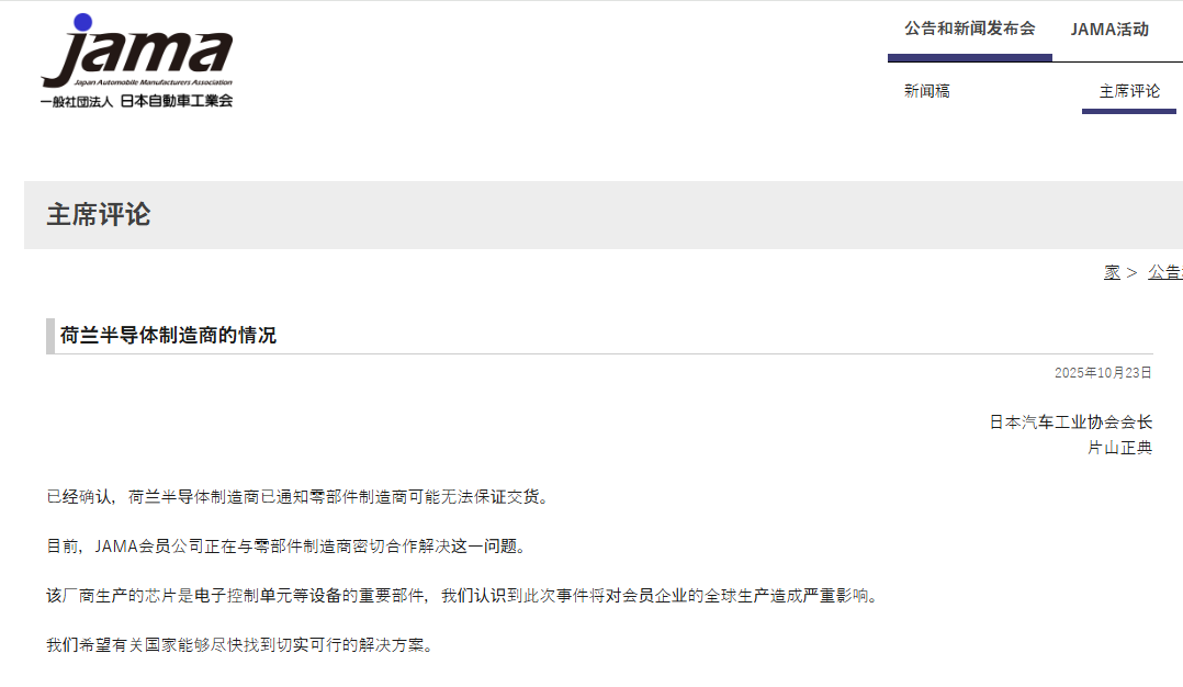大众汽车并非个例,欧美和日本的汽车行业都受到挑战。日本汽车工业协会10月23日也发布公告称,经确认,已收到荷兰零部件厂商发来的通知,来自荷兰半导体制造商的产品存在无法保证交付的可能性。目前协会各会员企业正与零部件厂商紧密协作,共同应对此事。该制造商生产的芯片是用于电子控制单元等产品的重要零部件,协会认识到此事将对各会员企业的全球生产造成严重影响。