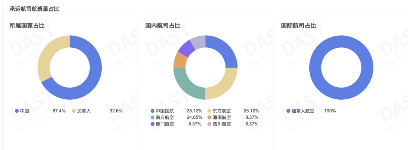 目前执飞中加航线的内地航司主要有6家,分别是国航,东航,南航,厦航,川航和海航,疫情前曾飞加拿大的首都航空尚未恢复中加航线,而加拿大方面只有加拿大航空一家在飞。根据航班管家的最新统计,10月通航的中加航线9条,航班量TOP3航线分别为上海浦东-温哥华(80班次)、北京首都-温哥华(70班次)、上海浦东-皮尔逊(36班次)。从承运航司来看,国内航司航班量占比67.4%,三大航航班量占比接近。