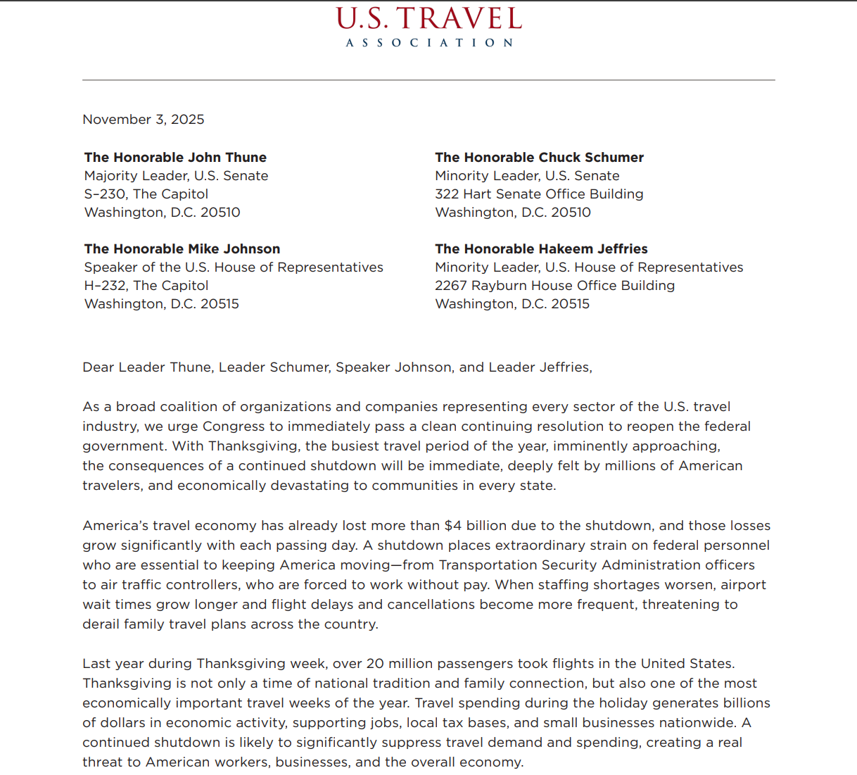 在信件中,美国旅游协会主席兼首席执行官杰夫·弗里曼(Geoff Freeman)向国会警告称,“随着美国全年最繁忙的旅行时期——感恩节——即将到来,若政府持续‘停摆’,其后果将立刻显现,数百万美国旅行者将深受影响,同时对全美各州社区造成灾难性的经济后果”。