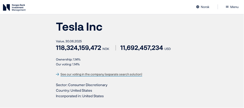 当地时间11月4日,据外媒报道,全球规模最大的主权基金之一、挪威政府全球养老基金明确表示,在即将召开的特斯拉年度股东大会上,将对特斯拉CEO埃隆·马斯克的“万亿美元薪酬方案”投出反对票。该基金是全球同类基金中规模最大的一家,同时也是特斯拉的第七大单一股东。官网显示,该基金持有特斯拉1.14%的股份。该项投资的价值约为1183亿挪威克朗(约合117亿美元)。