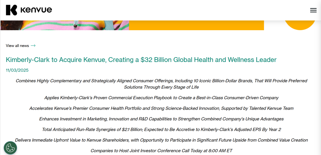 美国东部时间11月3日,美妆巨头Kenvue科赴发布公告,已与全球个人护理巨头金佰利公司(Kimberly-Clark)达成收购协议,金佰利将通过现金和股票交易的方式收购科赴所有在外流通的普通股。这笔高达487亿美元的交易,是近年来消费品领域最大的交易之一,标志着企业并购新趋势。科赴的官宣消息也直言双方联合预估年营收高达320亿美元,将超越联合利华,成为仅次于宝洁的全球第二大健康和个护产品销售商。