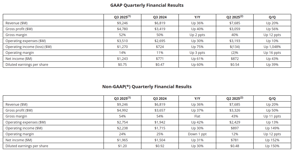 当地时间11月4日,AMD公布了截至2025年9月30日的第三季度业绩,报告期间公司营收达到92.46亿美元,同比增长36%,高于市场预期的87.4亿美元;美国通用会计准则下(GAAP)净利润为12.43亿美元,上年同期为7.71亿美元,同比大幅增长61%;Non-GAAP下每股摊薄收益1.20美元,高于市场预期的1.16美元。由于美国芯片出口限制,AMD第三季度业绩中未包含向中国出售的MI308芯片的收入。此前,AMD曾警告称,预计新一轮出口限制将使公司今年营收损失15亿美元。
