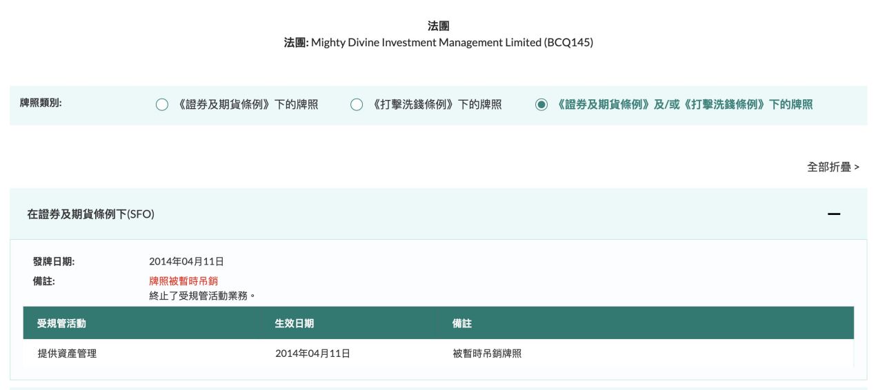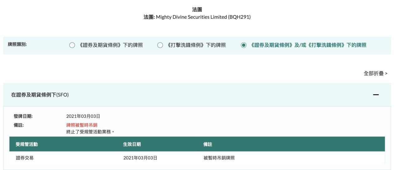 近日,香港证监会与香港保监局也同时出手,对上述三家公司相关牌照采取行动。记者查询香港证监会官网发现,Mighty Divine Investment Management Limited和Mighty Divine Securities Limited的牌照均已被处置,显示“牌照被暂时吊销”以及“终止了受规管活动业务”。