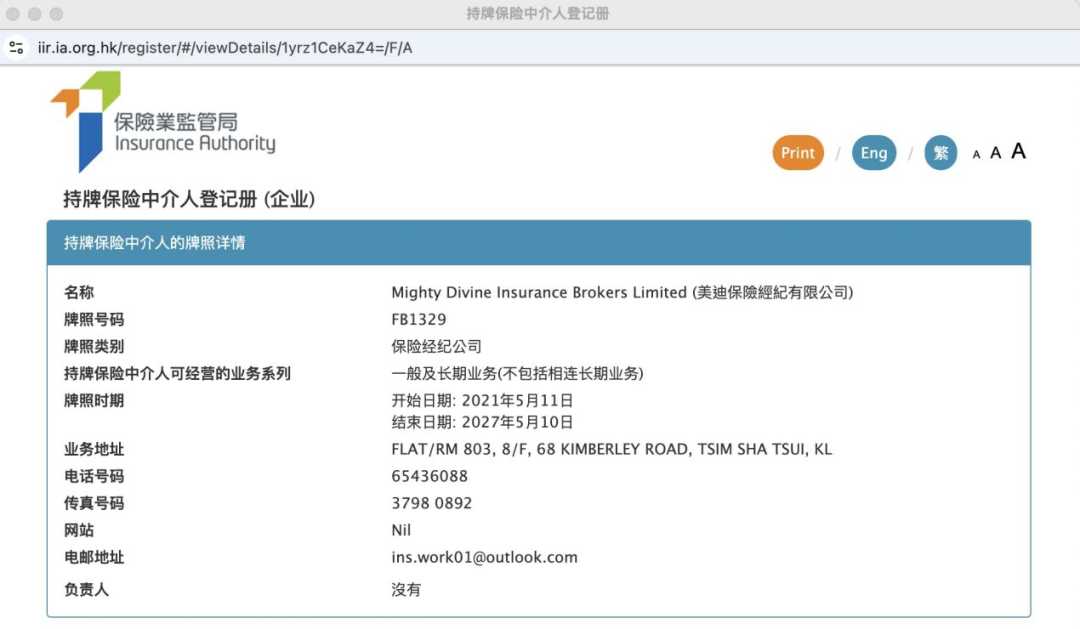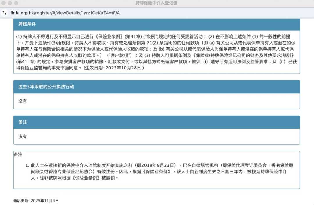香港保监局官网显示Mighty Divine Insurance Brokers Limited的牌照仍然有效,但牌照条件更新(如下图所示)。香港保监局要求Mighty Divine Insurance Brokers Limited的持牌人不得进行及不得显示自己进行《保险业条例》(第41章) 规定的任何受规管活动,不得收取、持有或处理任何客户或潜在客户款项,除非遵守所有适用法例及监管要求并已获得香港保监局事先书面同意等,生效日期为 2025年10月28日。保险监管新规强化客户资金保护机制。