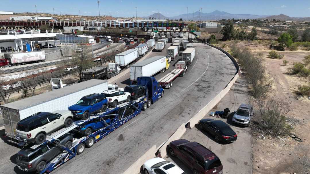 4月2日,在墨西哥索诺拉州诺加莱斯市,一辆装载多辆汽车的运输车(下中)行驶在墨美边境附近的公路上(无人机拍摄)。新华社记者李梦馨摄