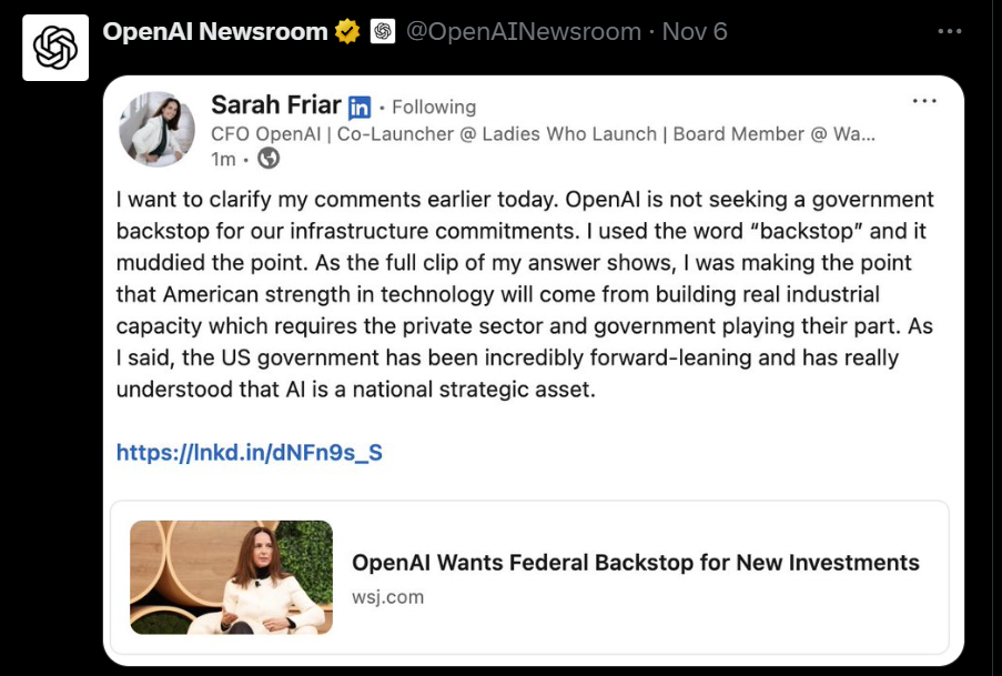 此前,OpenAI首席财务官萨拉·弗莱尔(Sarah Friar)在加州科技会议上表示,OpenAI正在“寻找一个由银行和私募股权组成的生态系统”来支持其基础设施建设,被认为是在暗示美国政府可以为OpenAI数据中心的融资进行担保。随后,弗莱尔也在社交平台发文澄清,称美国媒体的报道“模糊了重点”,OpenAI并不寻求政府为其基础设施投入提供担保。“我使用了‘后盾’这个词,从我回答的完整视频可以看出,我的核心观点是:美国在技术领域的实力来自建设真正的工业产能,而这需要私营部门和政府各司其职”。