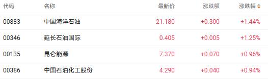 截至收盘,中国海洋石油(00883.HK)涨1.44%、中国石油化工股份(00386.HK)涨0.94%、中国石油股份(00857.HK)涨0.71%。消息面:除高股息资产受追捧外,中国石油化工股份近日发布三季报,尽管营收和净利润同比有所下滑,但市场仍关注其分红潜力。