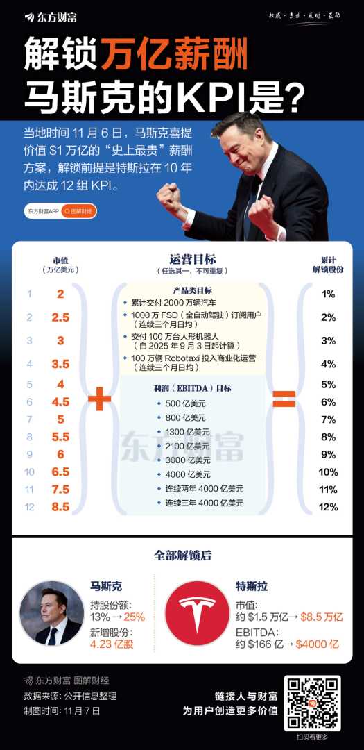 美国中部时间11月6日,特斯拉股东批准马斯克价值1万亿美元薪酬计划,或成全球首位万亿富翁。该计划是十年“业绩对赌”,马斯克需达成12组业绩目标,解锁后持股比例将增至约25%,多出股票价值1万亿美元。此前2018年薪酬“对赌”中马斯克表现惊艳,为股东带来超23倍回报。