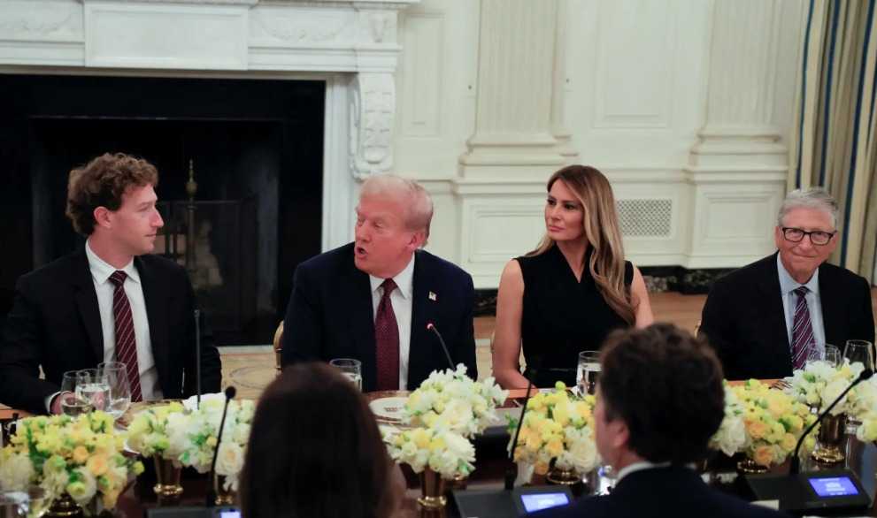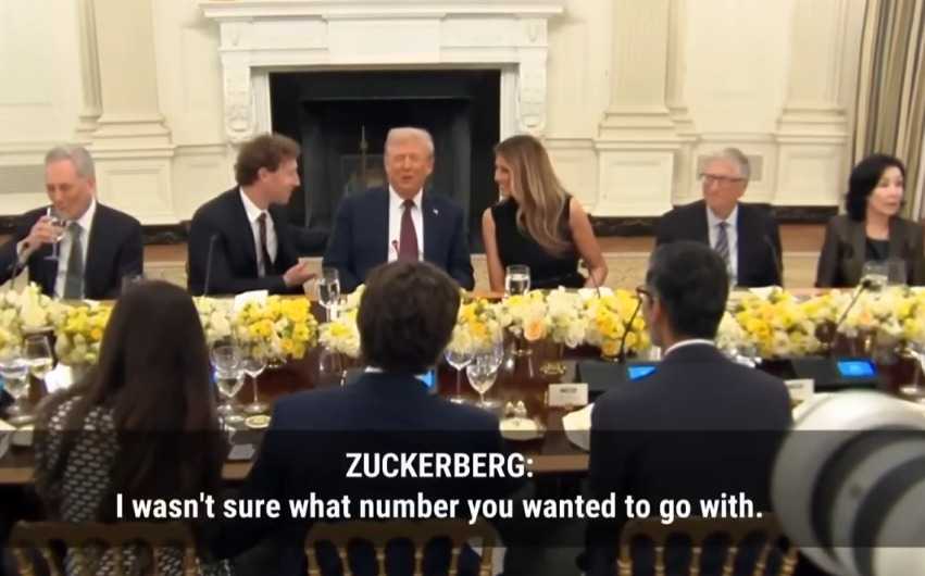 值得一提的是,6000亿这个数字的背后,其实有一段颇为尴尬的故事。今年9月,美国总统特朗普在白宫设宴招待美国科技领袖,比尔·盖茨、蒂姆·库克、桑达尔·皮查伊、奥尔特曼、纳德拉等科技大佬出席,扎克伯格更是直接坐在特朗普身边。