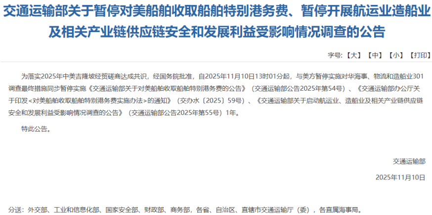11月10日,交通运输部发布公告,为落实2025年中美吉隆坡经贸磋商达成共识,经国务院批准,自2025年11月10日13时01分起,与美方暂停实施对华海事、物流和造船业301调查最终措施同步暂停实施相关公告1年,这一举措进一步稳定了经贸关系。