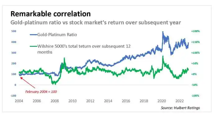 他们指出,在过去的20年中,黄金与铂金的比率与股市的走势展现出令人印象深刻的正相关性。下图显示,当黄金与铂金的比率呈上升趋势时,股市往往随之上扬;反之亦然。研究人员发现,在预测市场随后12个月的回报时,该比率“优于几乎所有现有的回报预测指标”,是股市回报预测的有力工具。